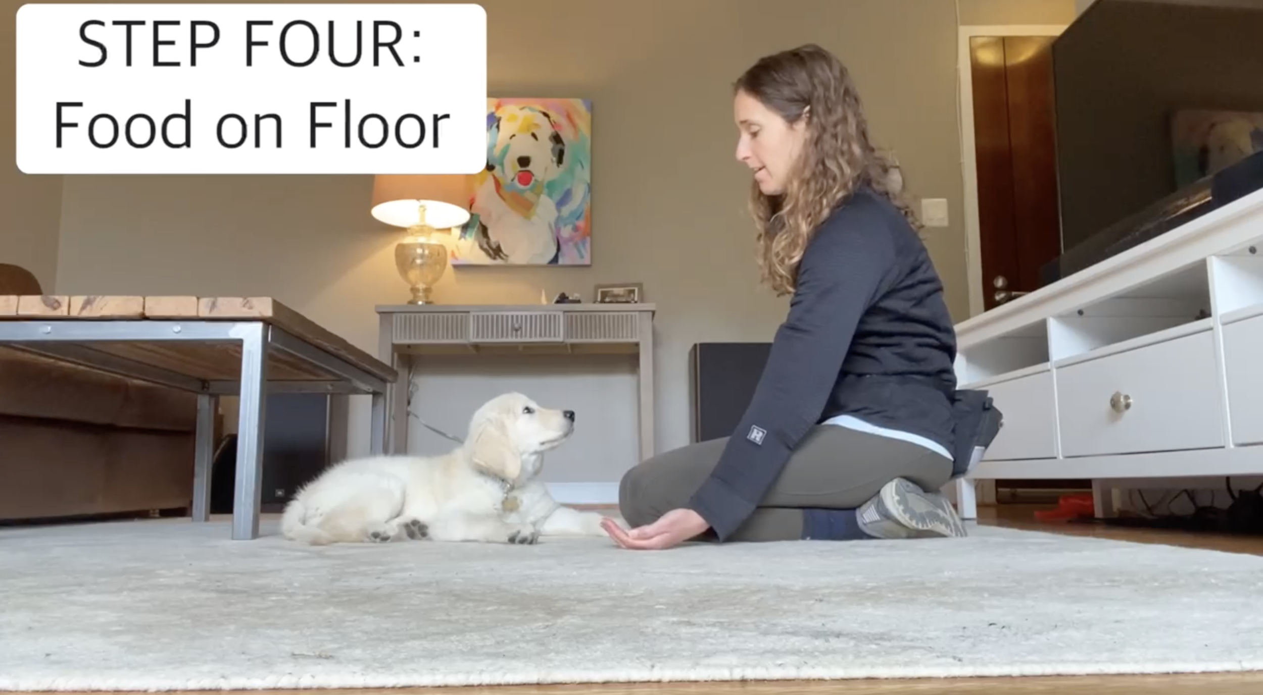 When they eat it, they should naturally lift their head up. Mark (you can say “yes” or use a location specific marker like “find it”) and reinforce (place another treat down in the same spot in front of your dog’s paws.