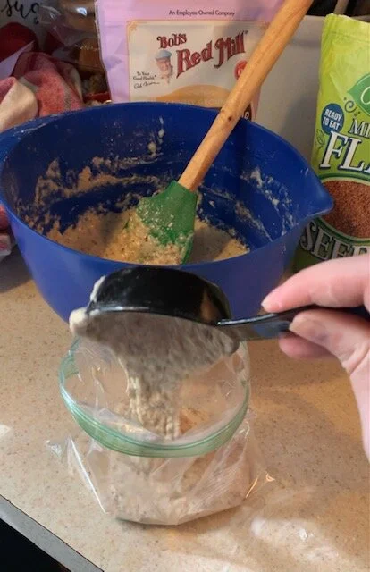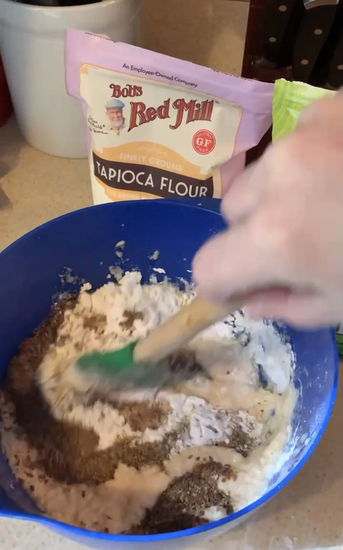 Add additional flour to thicken or water to thin it out (the type of flour you can use here is flexible! Tapioca flour will help it give some "chew" and stop it from being too crumbly). I usually will use both Tapioca flour and whole wheat flour.